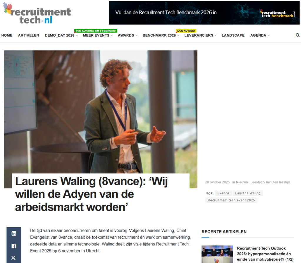 De tijd van elkaar beconcurreren om talent is voorbij. Volgens Laurens Waling, Chief Evangelist van 8vance, draait de toekomst van recruitment én werk om samenwerking, gedeelde data en slimme technologie. Waling deelt zijn visie tijdens Recruitment Tech Event 2025 op 6 november in Utrecht.